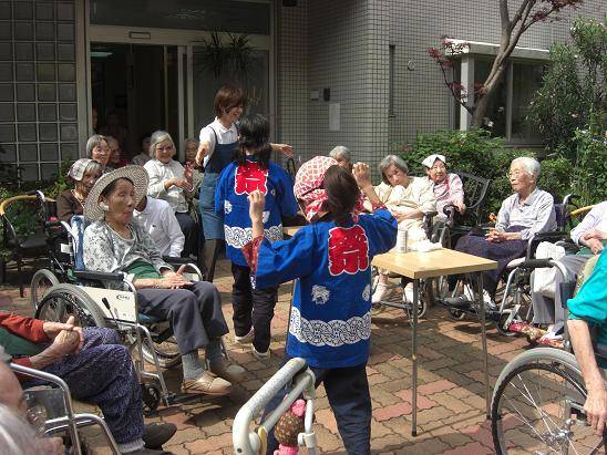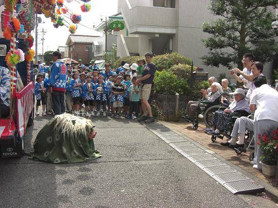 途中、デイサービスセンターや老人ホームでお囃子を披露し、